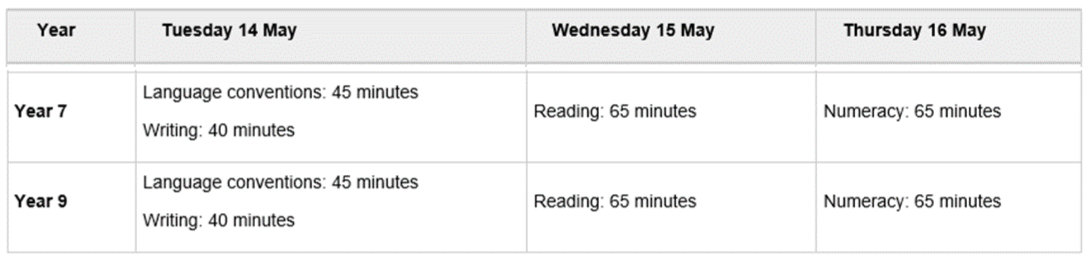 Across the three testing days, students participate in five different tasks. Firstly, they complete a language conventions test, which assesses their spelling, grammar and punctuation. This is a 45 minute test that is mostly made-up of multiple choice questions. Also on the first day, students complete a writing task. The stimulus and genre for this task will be unknown until the day of the test. On day two, students complete a reading test where they are given a magazine with reading stimuli and they are required to complete a range of comprehension questions within a 65 minute time period. Finally, on the third day of testing, students participate in two numeracy tests – one with a calculator and one without, a total combined time of 65 minutes. Throughout the afternoons of these testing days, students go to their classes as normal.